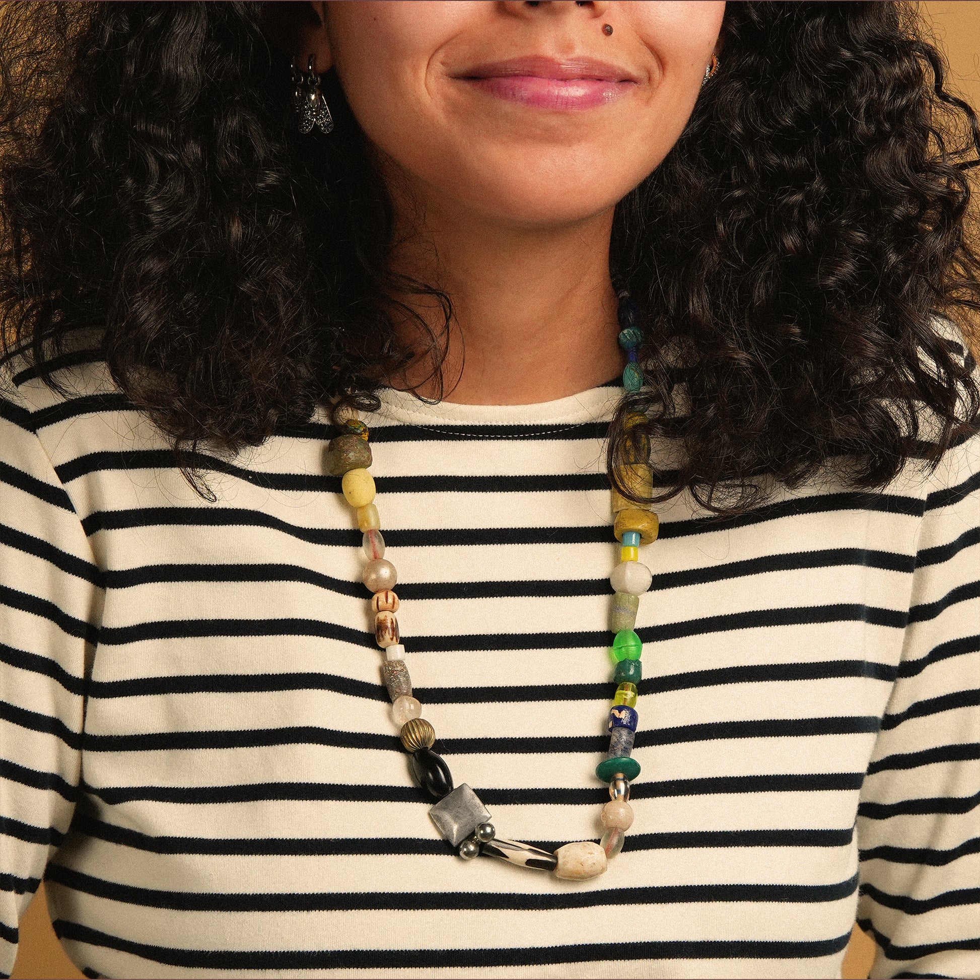 Perles anciennes et perles en plastique chinées au Caire, mélangées pour créer une pièce unique.