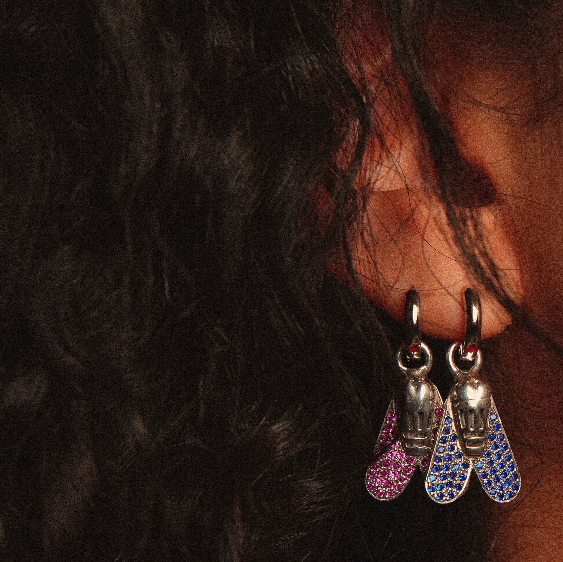 Boucle d'oreille individuelle, mouche en argent sertie de cristaux roses ou bleus.